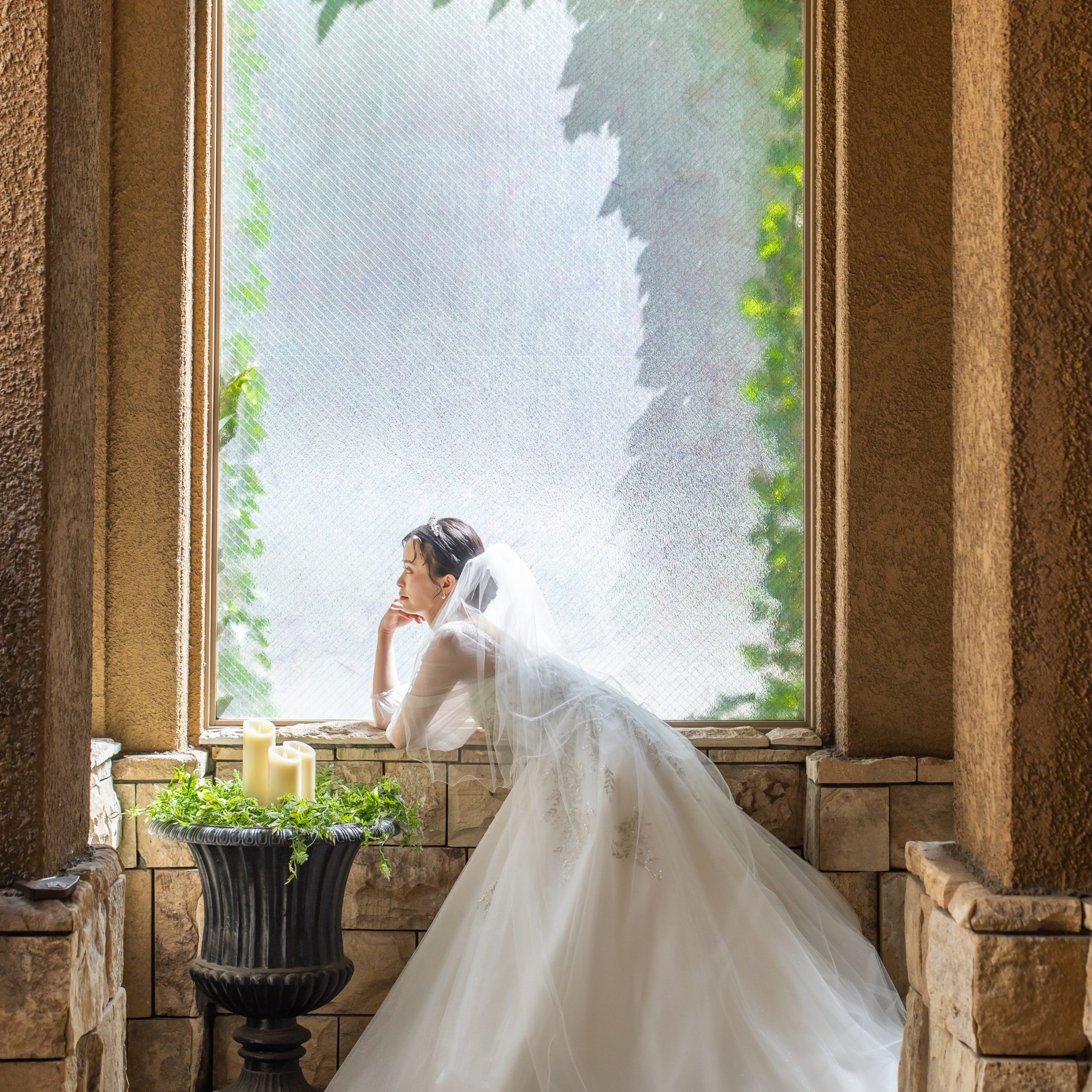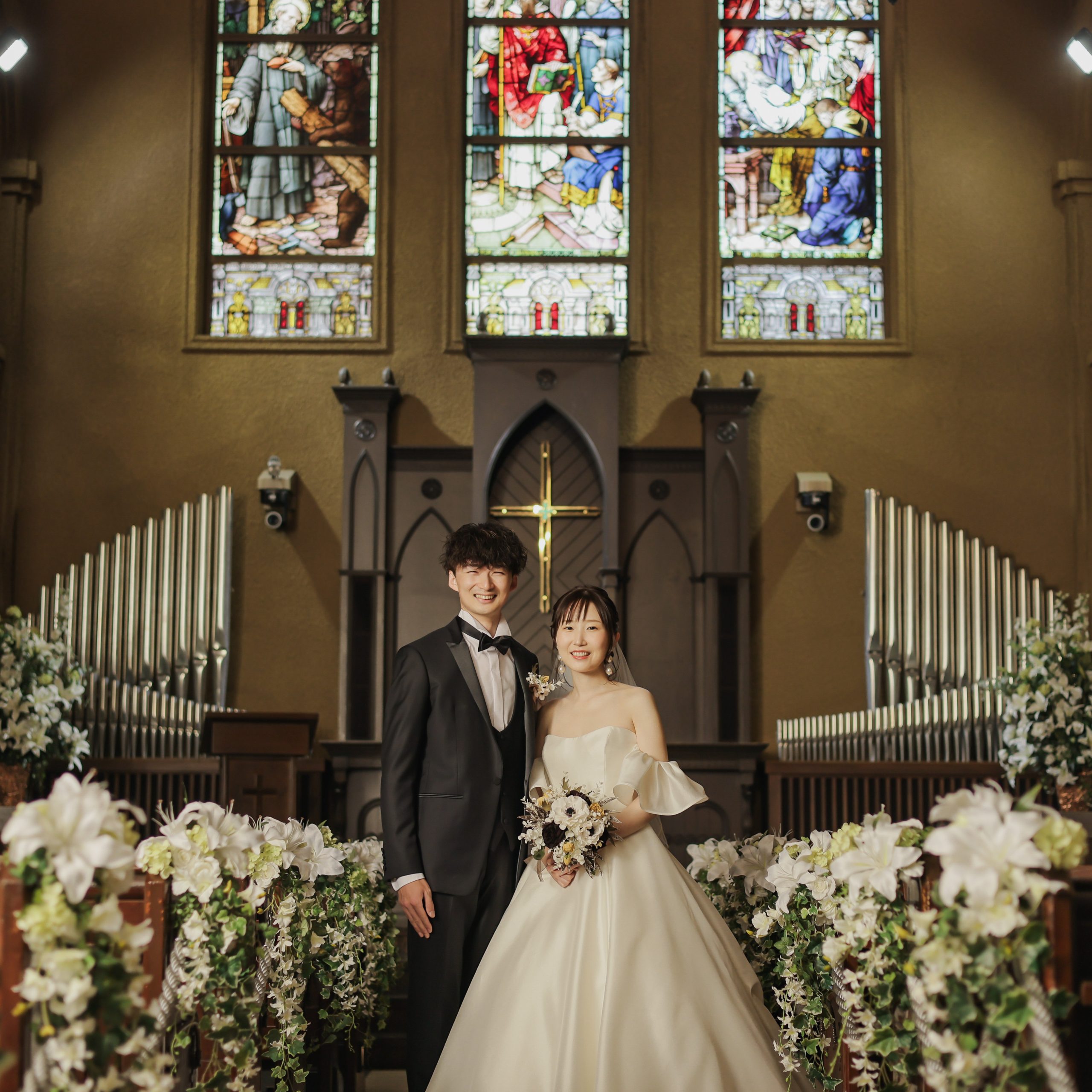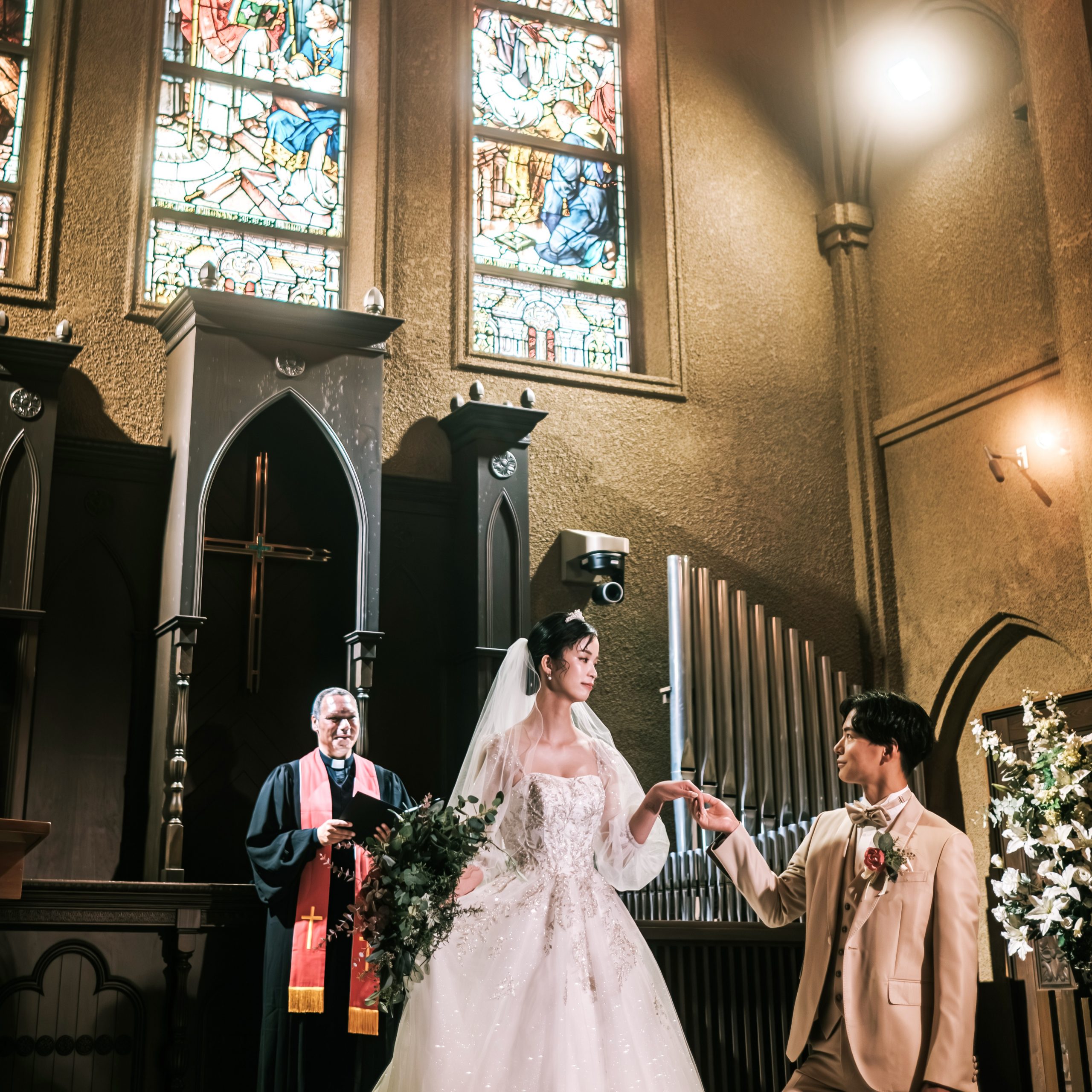 130年のときを重ねたステンドグラスが花嫁をより美しく幻想的に惹きたてる。
